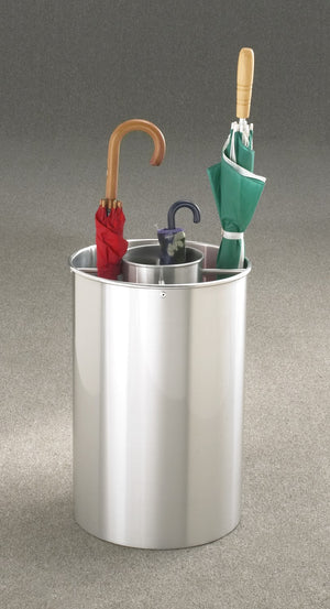 Rain or shine, Glaro umbrella stands are the perfect solution for the storage of full size and tote umbrellas.  Umbrella stands keep floors dry and safe during rainy or snowy days, and therefore, help reduce injuries from slips and falls.  They are very popular in coat check rooms, restaurants, office environments, waiting rooms, residential locations, retail, or any place people need to store their umbrellas when entering.  This model features a large capacity cylindrical design.  The outer compartments are provided for holding full size umbrellas, and the centered cylindrical container is designed to hold tote size umbrellas.  The polish-free, tarnish-proof, satin brass finish is baked onto the rustproof aluminum to ensure that the lustrous finish lasts indefinitely.
