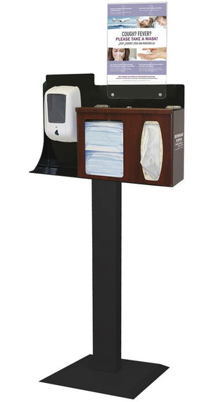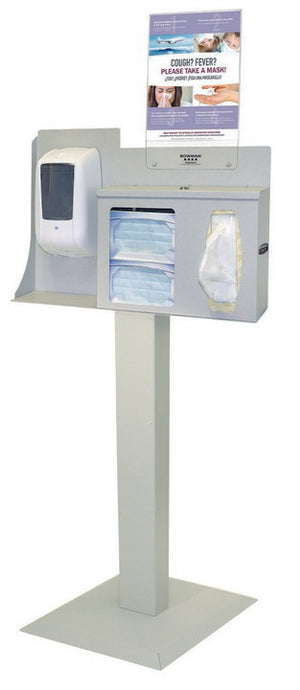 Cover Your Cough (CYC) Compliance Kits hold an assortment of personal protection equipment in a convenient and attractive dispenser. This kit holds two boxes of earloop face masks, one - two boxes of facial tissue, and one hand sanitizer dispenser (consumables not included). The sign holder is vertical and a variety of signs can be downloaded and printed from BowmanDispensers. Proper and consistent use of the products in this dispenser reduces the chances of spreading infectious bacteria and viruses, such as those found in influenza and the common cold. CYC Compliance Kits are ideal for use in public waiting areas, offices, and lobbies.
