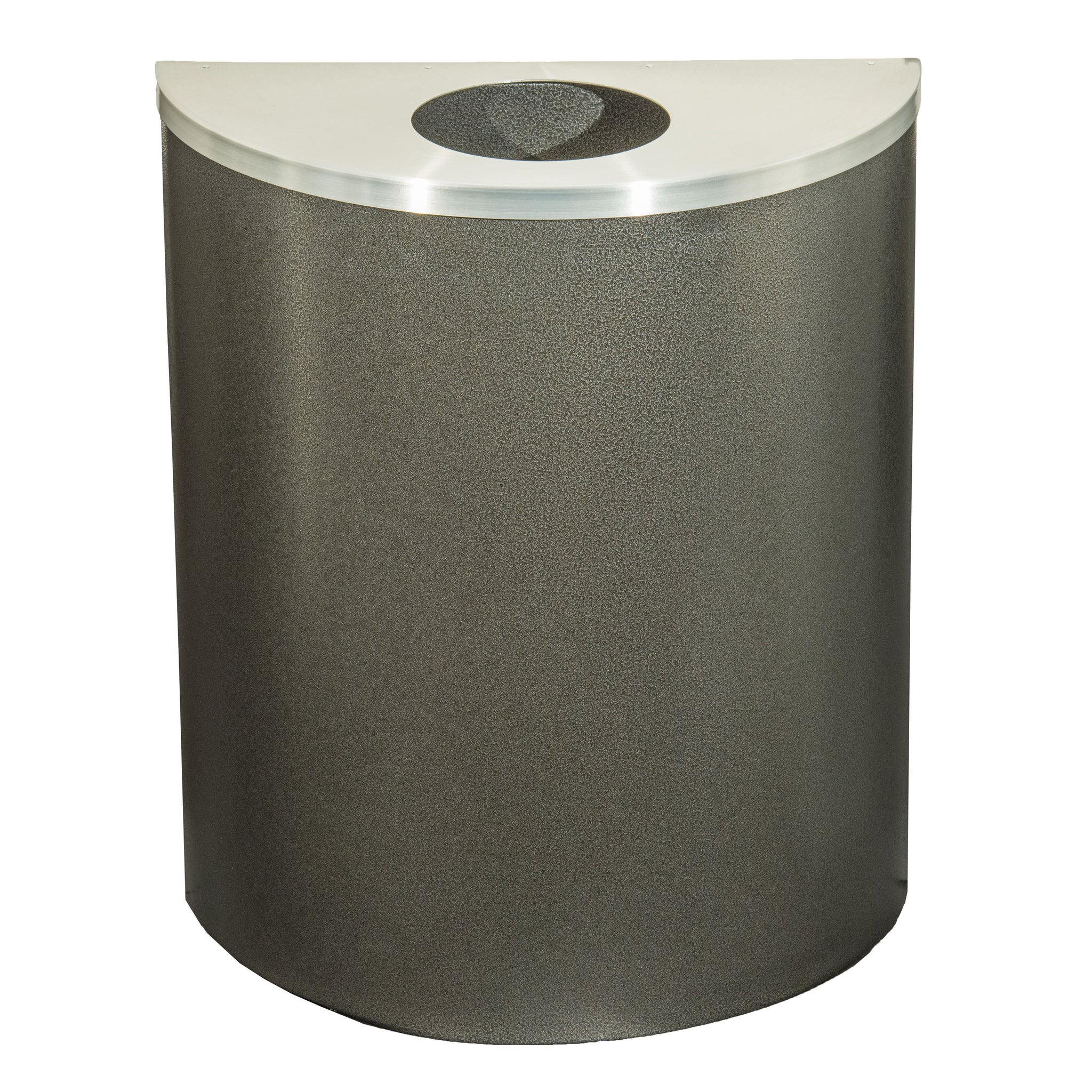 Glaro Profile Series 24" Half-Round Trash Receptacle with hinged lid and 8" round opening provides convenient waste access in busy commercial interiors. Finished in satin aluminum, this heavy-duty aluminum trash can combines durability with contemporary design for offices, healthcare facilities, and public buildings.