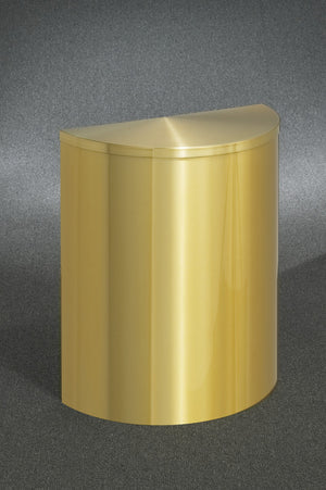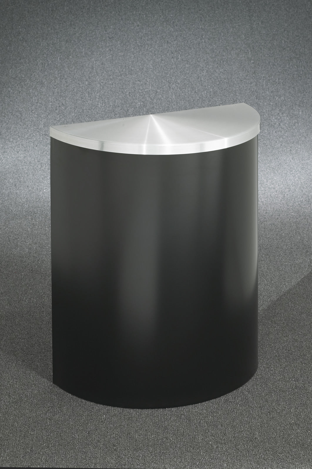 Glaro Profile Series 24" Half-Round Trash Receptacle with hinged cover only (no opening) provides concealed waste storage for professional indoor settings. Satin aluminum finish and heavy-duty aluminum construction deliver durability and clean architectural design.