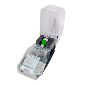 Dispenser (size: 9.45" H x 5.12" W x 3.94" D) High-quality wall mounted 1000 ml sensor activated dispenser Touch-free operation: eliminates cross-contamination, reduces the spread of germs MultiShot output option: precisely adjusts desired dose volume (0.4 – 0.8 – 1.2 ml) to avoid costly overuse Extra-long battery life due to clever energy saving system Dispenser made from durable ABS, POM Just hold your paper under the nozzle, and factory preset .4 ml of pleasantly scented foam toilet seat cleaner will dispense. Easy to install and maintain Clean white color goes with any decor Refill with Health Gards® Foam Toilet Seat Cleaner Refills, item: